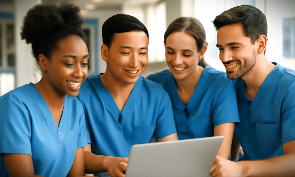 Junges Pflegeteam am Laptop